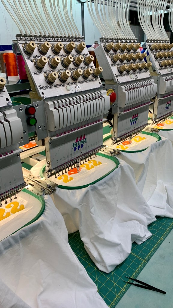 Tajima industrial embroidery machines, 6 heads, 12 heads, 6 heads cap embroidery machines and Single head for Cap embroidery.